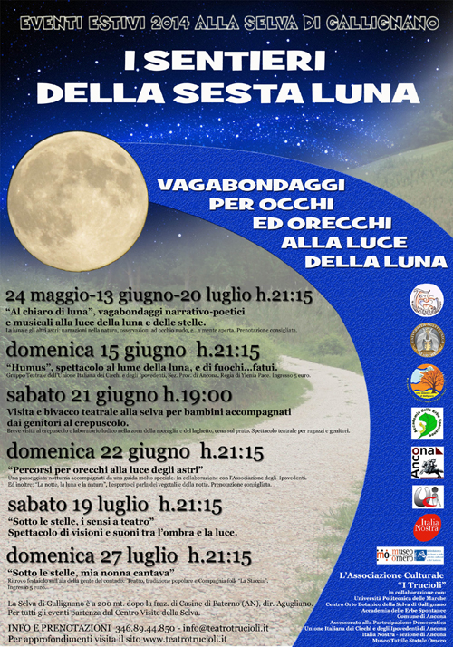 L'evento rientra all'interno della rassegna "I Sentieri della sesta luna" - Vagabondaggi per occhi e orecchie alla luce della luna, organizzati dall'Associazione Culturale "I Trucioli". Un calendario di appuntamenti da maggio a luglio 2014 che intende valorizzare lo speciale luogo di natura che è la Selva di Gallignano in un momento particolare di fruizione: la notte rischiarata dalla luna, in cui luce ed ombra creano effetti di particolare suggestione e, complice il silenzio della notte si viene a creare attorno ai rumori naturali una particolare intensità. E' un teatro quasi pioneristico, legato più a suggestioni e all'immaginazione, al senso dell'udito e del tatto che alla parola strutturata, come siamo soliti sentirla nel teatro di tradizione, affidata alla comunicazione espressiva e mimica degli interpreti di una drammaturgia. Accanto agli eventi teatrali anche passeggiate al chiaro di luna o sotto le stelle accompagnati da guide davvero speciali ed una festa di chiusura sull’aia del casolare della Selva, il 27 luglio.