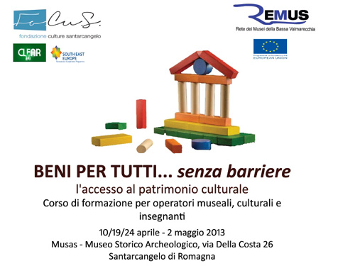Il corso si articola in quattro giorni 10/19/24 aprile e 2 maggio 2013 e ha lo scopo di fornire le conoscenze su accessibilità e disabilità, per garantire un approccio concreto e consapevole ed un'adeguata accoglienza ai visitatori e utenti con disagio fisico e psichico, presentando strumenti e metodologie per realizzare attività strutturate significative nelle realtà museali.